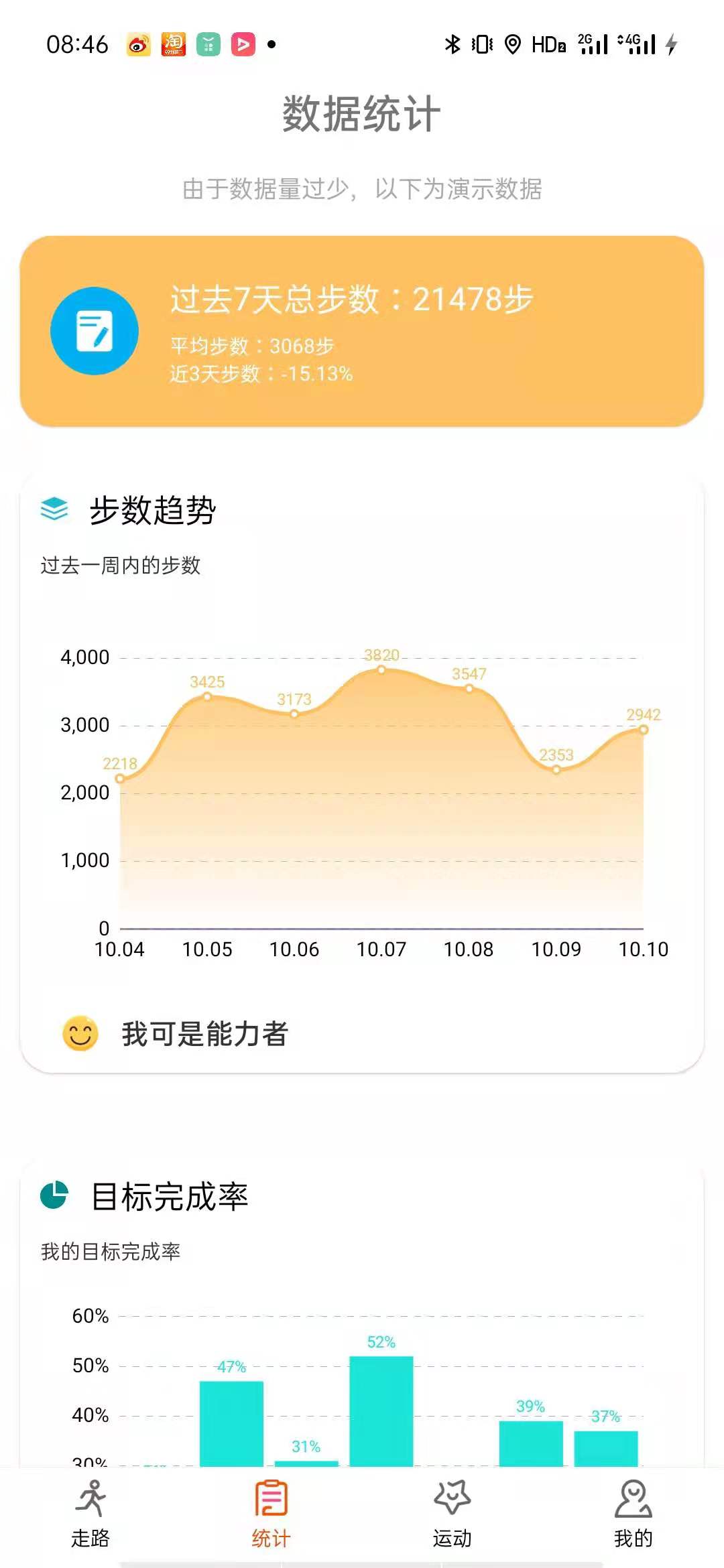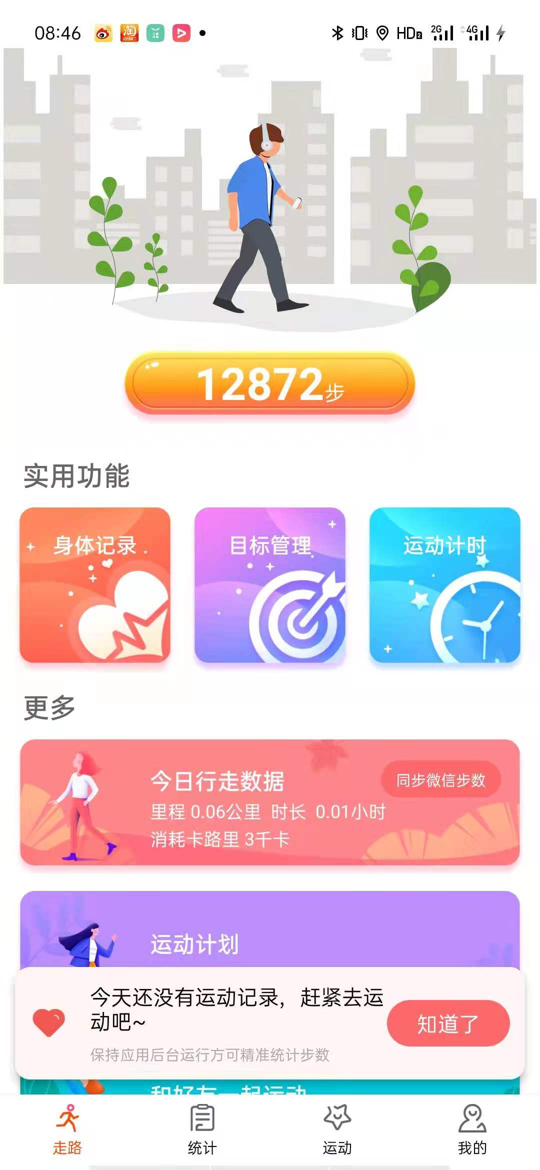 一款运动计步软件,运动记录、行走里程、卡路里消耗等,轻松掌握自己的运动和身体情况。 专业的数据分析帮您合理规划自己的运动目标。多种运动模式、跑步、健走、登山、徒步应有尽有。 并可设置目标,进行提醒。 步数统计,精准记录步数,通过微信同步部署,确保每一步都不会漏掉 身体围度记录,记录身体多种围度,身高,体重、胸围、腰围等 一款运动计步软件,记录您的运动记录、行走里程、卡路里消耗等